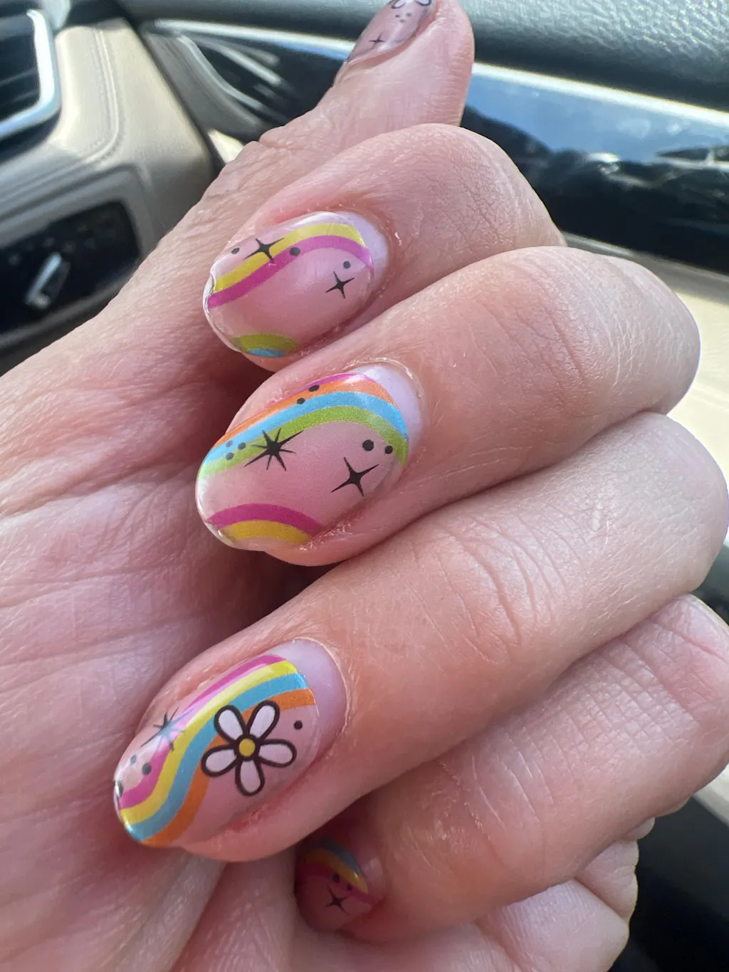 We are thrilled to announce our latest nail artist collaboration with the talented nail technician Janine Orpen, also known as @nailsbyjanine.x ! Janine has recreated her most popular manicure designs in gel nail stickers, bringing her unique and vibrant style straight to your fingertips. This exclusive collection features three stunning designs: a playful, colorful mix of smiley faces and psychedelic patterns; a dreamy, whimsical blend of rainbows and flowers; and a chic, contemporary combination of purple hues with hearts and sparkles. These gel strips capture Janine's artistic flair and attention to detail, making it easy for you to achieve salon-quality nails at home. 💅🌈