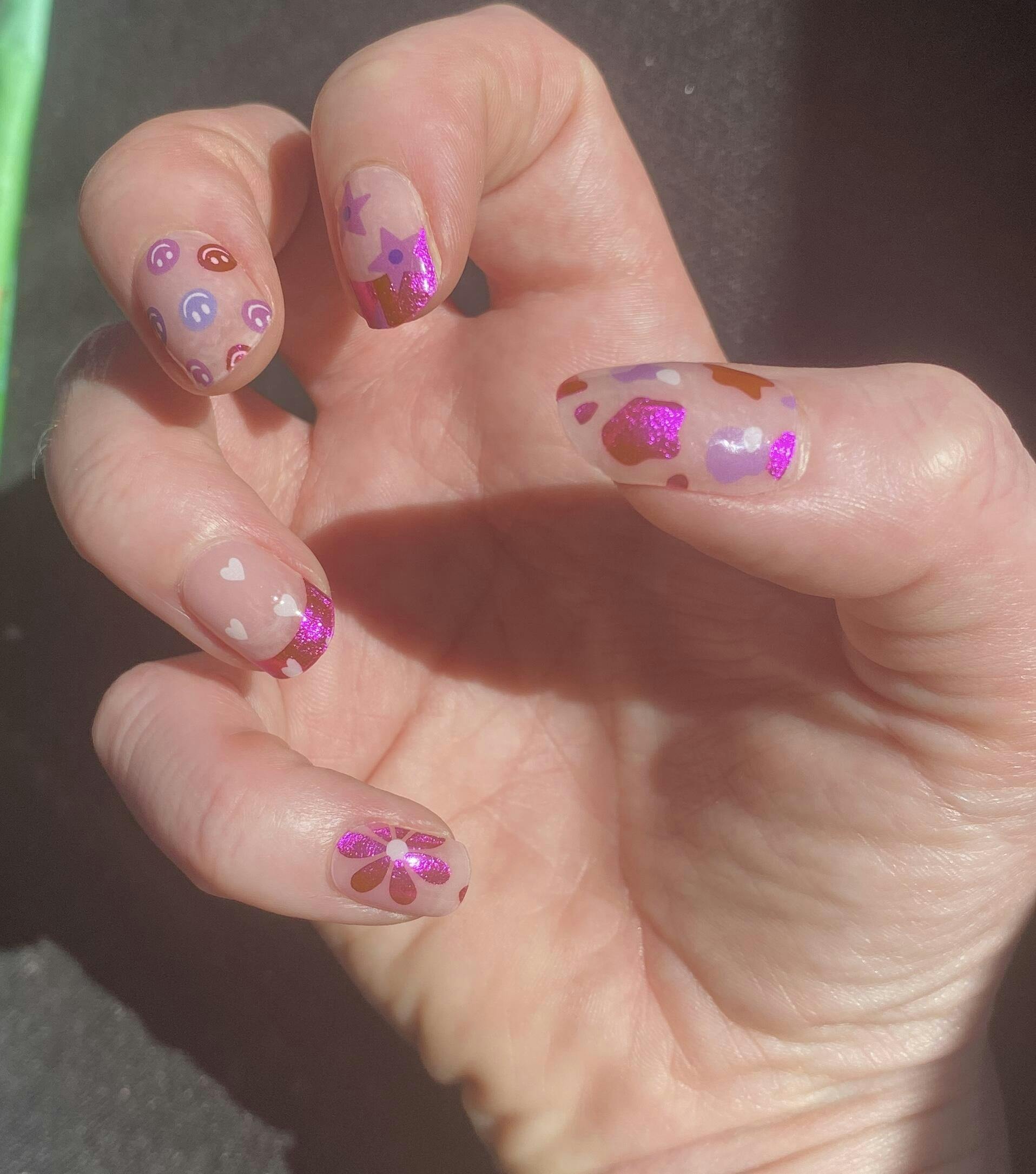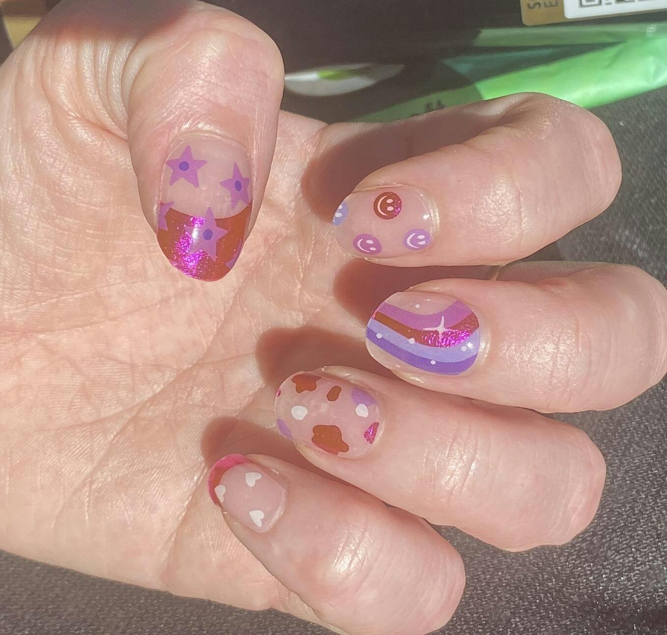 We are thrilled to announce our latest nail artist collaboration with the talented nail technician Janine Orpen, also known as @nailsbyjanine.x ! Janine has recreated her most popular manicure designs in gel nail stickers, bringing her unique and vibrant style straight to your fingertips. This exclusive collection features three stunning designs: a playful, colorful mix of smiley faces and psychedelic patterns; a dreamy, whimsical blend of rainbows and flowers; and a chic, contemporary combination of purple hues with hearts and sparkles. These gel strips capture Janine's artistic flair and attention to detail, making it easy for you to achieve salon-quality nails at home. š š